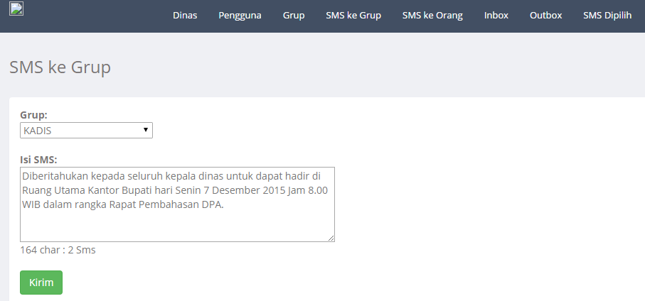 - Bisa mengirimkan sms kepada kelompok tertentu yang telah ada dalam database seperti kelompok Kadis, Camat, Asisten, Kasubbag dll